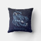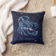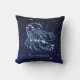 Gooi het kussen met het sterrenbeeld voor Schorpioen in zacht zilverblauw, bedekt met de sterren van het sterrenbeeld, tegen een sterrenhemel achtergrond die van diep middernachtblauw tot zwart is gegradeerd.