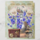 Vintage fan, lavendelbloemen in een houten doos over kanten label met een vogeltje en oud schrift, een Gramophone, Petten doos over goud en groen oud papier. Goud en groen oud papier op achterzijde