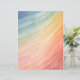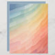 Een levendig kleurverloop gaat van koele blues aan de bovenkant, door groen en geel, naar warme sinaasappels en roze aan de onderkant. De compositie bestaat uit geometrische vormen die een patroon van gebogen lijnen vormen, waardoor een gevoel van beweging en diepte ontstaat.