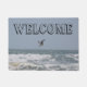Een deurmat met een foto van een meeuw die over de Atlantische Oceaan vliegt en een vis in zijn mond draagt.