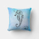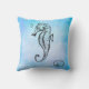Een kussen met een zwarte inktschets van een zeepaardje en een zeeschelp. De achtergrond is een blauwe waterverf textuur.