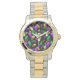 Seamless pattern of bright purple, green, and gold feathers on black Mardi Gras background. Design for the Mardi Gras holiday.