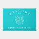 Turquoise shell art welkomstmat met bedrijfs- of familienaam sjabloon. Wit op tropische blauwe kleur met gebogen tekst aan de bovenkant en naam, of enige tekst langs de onderkant.