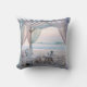 A romantic gazebo adorned with sheer pastel drapery and a couch sits on the beach sand, accompanied by the backdrop of crashing waves