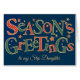 Een stijlvolle kerstkaart voor een Step Daughter, met 'Season's Greetings' in rood en wit en donkergroen en wit polka dot belettering, geschetst in goud-effect op een diepblauwe achtergrond en verspreid met goud-effect en rode sterren. Je kunt de binnenboodschap op dit tekstgebaseerde digitale ontwerp van Judy Adamson eenvoudig wijzigen en als je geen kaart kunt vinden voor de persoon naar wie je het wilt sturen, is er een aangepaste frontversie die je kunt personaliseren.
