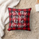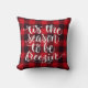 Fun reversibele kerstgooien kussen in een rode en zwarte buffelpleister achtergrond met "Dit is het seizoen om vriesdrogende te zijn"-typografie aan de ene kant en sneeuwvlok aan de andere kant.
