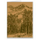 etsen van bergen en bos in sepia-tonen