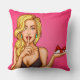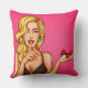 Gooi een kussens met een pop illustratie van een sexy blond meisje met cadeaudoos in hand en die vraagt om stilte.