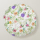 Dit Shabby Chic Floral ronde kussen heeft roze bloemen, gele bloemen, paarse bloemen en rode bloemen op een veld van groene bladeren.