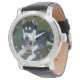 Siberische Husky puppy fotografie op Mannen Zwart Lederen Strap Watch. U kunt veranderen voor alle andere polshorloges voor mannen, vrouwen en kinderen met dit afbeelding - schattig zwart en wit met prachtige blauwe ogen zittend op het gras en recht toekijkend. Geweldig cadeau voor #FathersDay. Voeg jouw tekst toe.