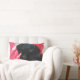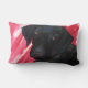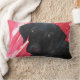 Zwart lab tegen rode marmer achtergrond op een 16x16 polyesterkussen