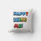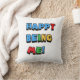 Vierkant kussen met heldere primaire kleuren, ideaal voor kinderkamer of slaapzaal. "Blij om mij te zijn!"