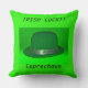 Een Sierkussen met een Iers groen Pet en IRISH LUCK met Leprechaun op de bodem die helder en kleurrijk is.