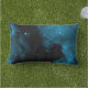 Uit deze wereld kussen met een zwart en blauw ruimtepatroonontwerp als achtergrond.