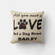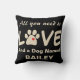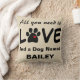 Kute goot kussens met een hondenpoot met hart erin en gezegde, alles wat je nodig hebt is liefde en een hond genaamd Bailey. U kunt het met de naam van uw eigen hond aanpassen aangezien de naam een voorwerp van de sjabloon is. De omgekeerde kant van de kussen heeft hetzelfde gezegde dat tegenover een kleurencombinatie staat. Geweldig voor jou of voor een hondenliefhebber dat je kent.