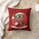 Drijf kussens met een afbeelding van een schattig glimlachend gelukkig meisje of jongen, de baby draagt rode en witte kleren en houdt een cadeau vast; met bewerkbare tekst-sjabloon voor jouw naam of boodschap, kerstfeestdagen met een rode achtergrond