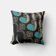 Gooi de kussen met afbeelding van zwart en turquoise batik op de voorkant en een zwart gevlekt ontwerp op de achterkant tegen een turkooisachtergrond.
