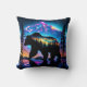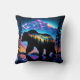 Artistieke weergave van een beren silhouet dat een bos- en berglandschap omlijst bij zonsondergang, reflecterend op water.