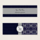 Een naadloos digitaal patroon afbeelding van zilvergrijze en marineblauw demask bovenaan, en verouderde marine en middernacht blauwe satijestreepstrepen onderaan, met een lintbekleding met een aanpasbare monogram tekstzegel.