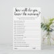 "Hoe goed ken je mama?" Wie kent de aanstaande moeder het best? Eenvoudig aandenken baby shower of gender onthullen partij spel met een leuke, casual hand-lettered script. Het klassieke ontwerp bevat een moderne handgeschreven citaat typografie overlay. Voor andere kleuren of bijpassende producten, bezoek de JustFharryn Zazzle winkel, of neem contact op met de ontwerper, c/o Fharryn@yahoo.com Alle rechten voorbehouden. #bohochic #zazzlemade"