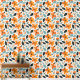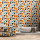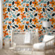 Oranje bloemetjes, blauw en donkergroen gebladerte bloemenstok en schil behang.