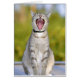 Verbluffende foto van een gestreepte kat die recht zit, met kop en mond wijd open alsof hij zingt.