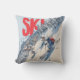 An exhilarating winter scene captures skiers carving down a steep, snow-covered mountainside above a colorful alpine village. Crisp white snow contrasts with deep blue shadows and towering frosted trees, while bold red lettering adds dynamic energy to the composition. The dramatic angle and sense of motion evoke speed, freedom, and the thrill of downhill skiing in a breathtaking mountain setting.