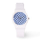 Een repetitief patroon verspreidt zich over een hemelsblauwe achtergrond op dit leuke horloge.