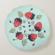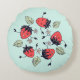 Stomme aardbeien kinder kussen voor meisjes met een vectorafbeelding die 5 vrolijke glimlachende aardbeienpersonages laat zien die dansen in een cirkel omringd door bladeren en bloemen van hun eigen soort. Fun design met een veer-geest voor iemand die van deze juweel houdt.