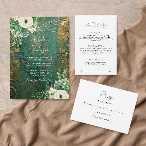 smaragdgroengoudelegantromantischfloreelbloemenmooitijdloosheidscripttypografiehuwelijkscadeau labels