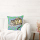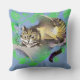 Dit ontwerp show mijn glimlachende Cheshire Cat op basis van Tenniel's oorspronkelijke zwarte en witte afbeelding, in een boom tegen een blauwe achtergrond, met groene bladeren. De achterkant van het kussen shows de Cheshire Cat weg.