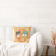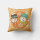 Sneeuwse Oranje Stippen en Snowflakes vakantiekussens, zo en kleurrijk, hebben een witte sneeuwvlokken op een roze achtergrond met een oranje cirkel met witte stippen en elke kant heeft een glimlachend sneeuwkoppel met een pet, sjaal, wortelneus en sneeuwvlokken!