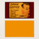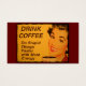 Een lachende vrouw met een retro-rode lippenstift en nagels drink haar kop ochtendkoffie. In de titel staat: "Koffie Drink - Snellere dingen sneller doen met meer energie."