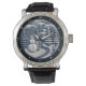 This delightful watch face showcases a charming winter village. A friendly snowman stands prominently by a winding, frozen river, surrounded by snow-laden pine trees and cozy houses nestled in the hills. The artistic landscape captures the serene beauty of a peaceful winter day. This decorative timepiece is a lovely and classic addition, perfect for evoking seasonal charm.
