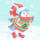 Een winterfeestelijke Pinguïn schuift vrolijk over het ijs als delicate sneeuwvlokken herfsten tegen een minty blue sky! Originele illustratie van kunstenaar, Noël Snow.