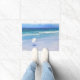 Snowy Egret in Flight op Florida Beach. Witte stekels vliegen op het strand met blauw water, zand en oceaangolven. Kuststranddecor met kristalhelder blauw tropisch water en wit zee schuim met sneeuwleien tijdens de vlucht.