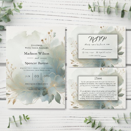 Nodig uw gasten uit in tijdloze elegantie met deze prachtig ontworpen huwelijksuitnodiging van het Soft Golden Dusty Blue Romance collectie. Met zachte waterverven in stoffig blauw en saliegroen, is dit ontwerp subtiel geaccentueerd met sierlijke gouden bloemenillustraties voor een verfijnd, modern botanisch gevoel. Het zachte kleurenpalet en de subtiele glinstering maken het ideaal voor romantische tuinbruiloften, chique soirées of elk feest dat wordt aangeraakt door de charme van de natuur. Volledig aanpasbaar met uw evenementdetails, deze uitnodiging is een serene en stijlvolle manier om uw grote dag aan te kondigen.