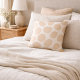 Earth-toned graphic design in layered sand, beige, and soft clay hues. Rounded, irregular shapes form a repeating geometric pattern with a printed tactile look. Ideal for neutral living rooms, reading chairs, or bedroom accents that need gentle pattern and balanced color.