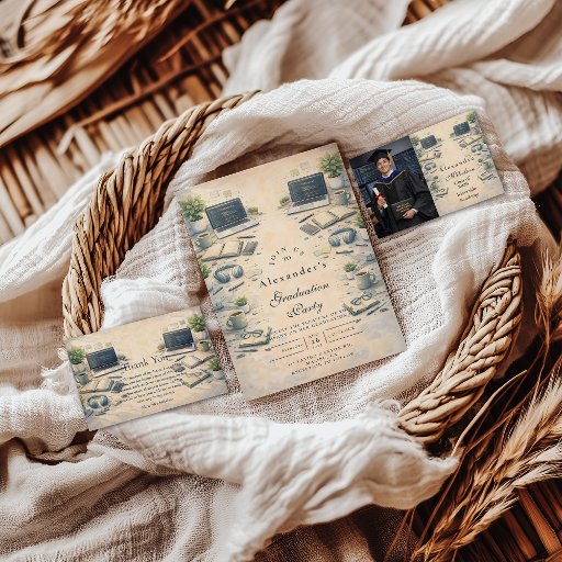 Celebrate a major academic milestone with this refined software engineering graduation design, inspired by modern technology and classic academic tradition. Featuring coding icons, laptops, technical symbols, and a parchment-style background, the artwork reflects problem-solving, innovation, and years of focused study in computer science and software development.