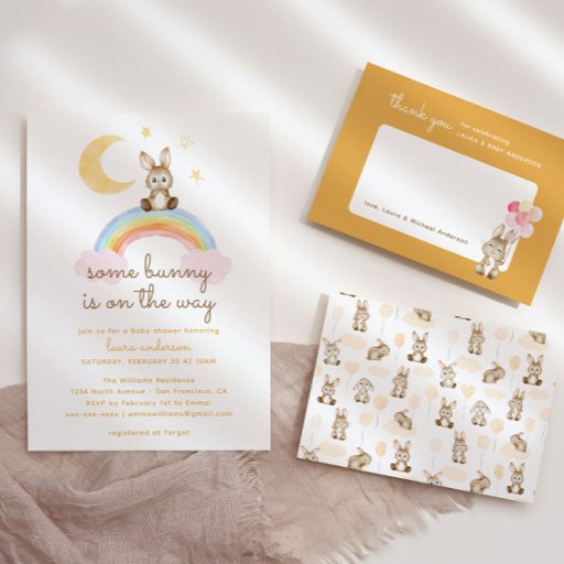 Dit ontwerp maakt deel uit van het "Some Bunny is on the Way" baby shower collectie. Het beschikt over schattige design met waterverf konijnen, paasbloemen, regenboog en wolken in genderneutrale tinten (bruin, sinaasappel, beige, geel en blush roze). Grappige briefpapier suite met konijntje citaat.