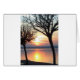 Ontwerp: Ein romantischer Sonnenuntergang am Zie, in dem sich die oranje Sonne zwischen zwei schwarzen Baumsilouetten spiegelt.