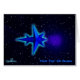 Een eenvoudig, blauw-toon 3D fractal afbeelding dat op een gestileerde ruimteschip lijkt dat op een starre achtergrond wordt toegevoegd. Concentrische ringen (zwaartekrachtgolven?) komen uit het ruimtevaartuig voort in het schijnbaar lege vacuüm van de ruimte. Een lichtblauwe aura omringt het ruimtevaartuig, misschien het resultaat sneller dan licht reizen.