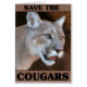 Een close-up van een cougar met de woorden Save The Cougars omringend.
