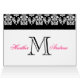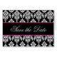 Zwart en warm roze Damask Monogram opslaan de datumkaarten. Pas op de binnenkant met uw trouwinformatie aan gebruikend de herinneringen of selecteer "pas"voor meer het uitgeven opties aan. Layout en ontwerp door Elke Clarke ©2010. Damaspatroon met een vergunning voor commercieel gebruik. Geen duplicatie toegestaan.