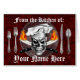 Deel je killerrecepten op deze cefbonenkaarten. Met deze coole en klastige recept-kaart is er genoeg ruimte om een lange lijst van belangrijke ingrediënten op te nemen, evenals gedetailleerde instructies voor het koken. Hij heeft een charismatische metalen-achtige chef-schedel voor twee scherpe gekruiste brandende chef-messen, en een getande zilveren platter, tegen een demperde achtergrond. Met het aanpassingshulpmiddel kunt u het achtergrondontwerp verwijderen om een kleur te kiezen die overeenkomt met uw stijl. De doopvont kan eveneens worden veranderd. Een leuk en uniek geschenk voor de hoofdkok, sous chef, thuiskok, lijnkok, of iedereen met een hevige passie voor het koken van killervoedsel!