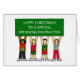 Vier tekenfilmpersonages in feestgevloeide sporten draag, met een donkergroen teken dat zegt: 'Gelukkig Kerstmis voor een speciale draaiende instructeur'.