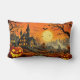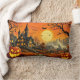 Een griezelige Halloween-omgeving met vleermuizen die onder een volle maan vliegen in een griezelige oranje verlichte sfeer.