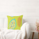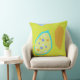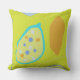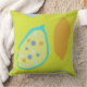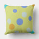 Dit kussen bevat expressieve en spontane artistieke vlekken en polka stippen in oranje, wit, blauw en turquoise. De achtergrond is gewoon groengeel.