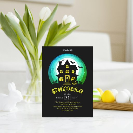 Maak uw Halloween-feest onvergetelijk met deze spectaculaire Halloween-feestuitnodiging met een spookachtig spookachtig spookhuis. Dit ijzingwekkende ontwerp zet de perfecte toon voor een nacht vol griezelig plezier en spookachtige sensaties. De gedetailleerde illustratie van het spookhuis tegen een donkere, maanverlichte hemel zal rillingen over de rug van uw gasten sturen. Perfect voor Halloween feesten, spookachtige bijeenkomsten, of een spookachtige viering. Pas de tekst aan uw evenementdetails aan en laat de festiviteiten beginnen! Ideaal voor zowel kinderen als volwassenen Halloween feesten.