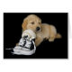 Golden retriever pup met sneakers en softbal.